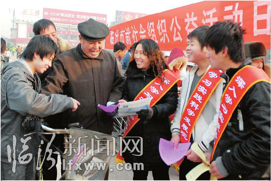 12月22日,市烹饪协会的工作人员正在为市民讲解餐饮行业信息。当日,主题为“爱心汇平阳、公益进万家”临汾市新社会组织公益活动日在平阳广场启动,全市30余家社会组织集中开展了农业科技、下岗人员培训、义诊等公益活动,更好地服务于社会。 本报记者 闫锐鹏 摄
