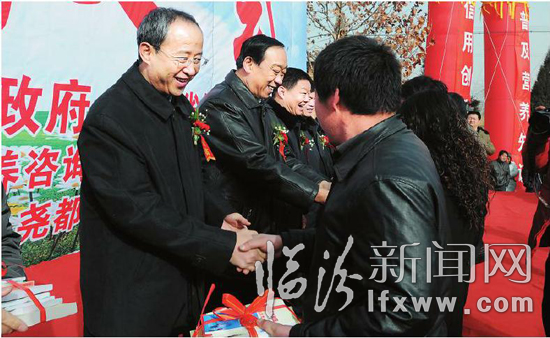 市领导谢海、王文英、郑中夏出席启动仪式,并为部分农户代表赠送健康挂图和图书。 图为刘维佳、谢海等发放《健康入农户》挂图时的情景。本报记者 李虎威 摄