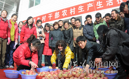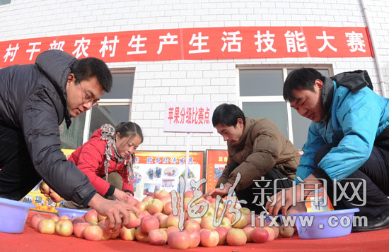 临汾新闻网讯 2010年1月12日,由吉县县委组织部组织的“大学生村干部农业生产技能大赛”在吉县上东村举行,全县72名大学生村干部全部参加比赛。比赛分苹果分级、切菜、苹果套袋、果树修剪和创业成果展示,旨在提高大学生村干部在农村的干事创业能力。( 记者 李虎威 摄)