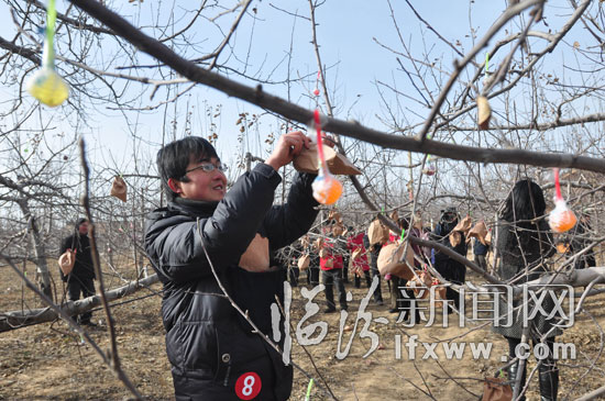 2010年1月12日,大学生村干部在进行苹果套袋比赛。
