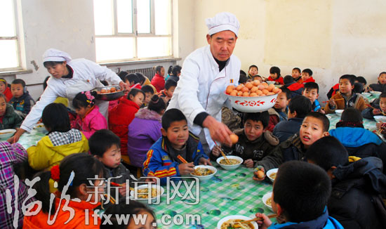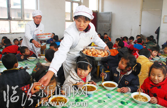 在洪洞县龙马乡塾堡学校,餐厅工作人员在发放鸡蛋。