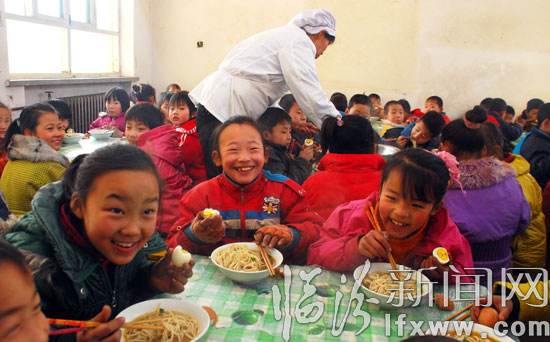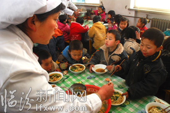 在洪洞县龙马乡塾堡学校,餐厅工作人员在为学生加餐。