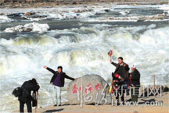 1月16日,游客在黄河壶口瀑布景区观赏瀑布。随着气温的回升,吉县黄河壶口瀑布上游冰凌开始消融,水量大增,河水变清,不仅给冬日的黄河壶口瀑布带来勃勃生机,也为当地的居民带来了无限商机。本报记者 闫锐鹏 摄