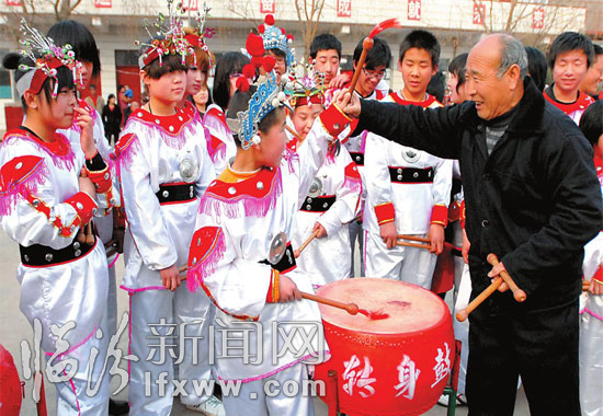 三月九日, 襄汾县新城镇夏梁村“转身鼓”的第八代传承人侯生海正在教孩子们打鼓的要领。该村在大力发展新农村建设的同时,积极推进文化遗产保护为该村传统“转身鼓”的传承和发展做了大量卓有成效的推广工作。 本报记者 闫锐鹏 摄