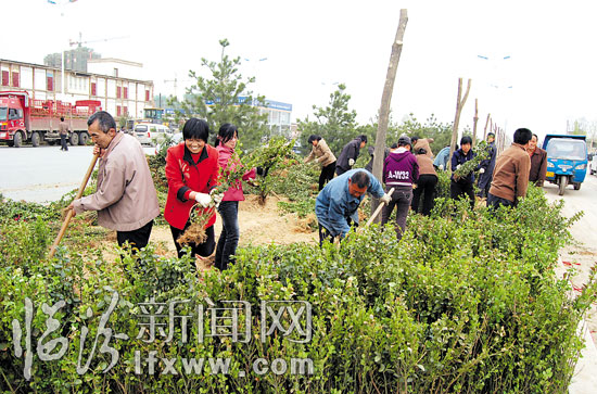 临汾新闻网讯 4月10日,临汾市城市绿化队工作人员正在对滨河路北延的绿化带进行绿化。绿化队抓住栽植苗木的最好时段,栽植苗木,绿化环境。 记者 李自强 摄