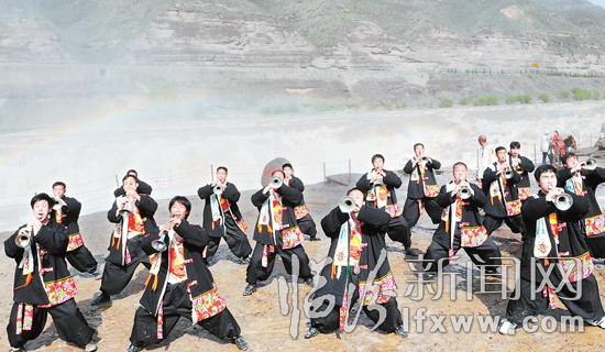 4月22日,为备战世博会,唢呐手在吉县壶口瀑布岸边进行排演。据了解,世博会期间,吉县壶口唢呐队将参加上海世博会山西活动周多场大规模演出,他们将把浓郁的黄河文化展示给全世界。本报记者 李虎威 摄