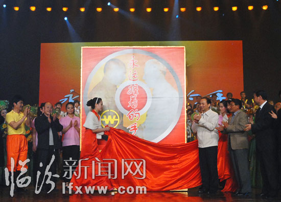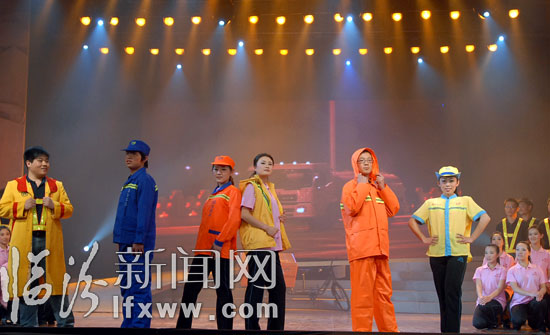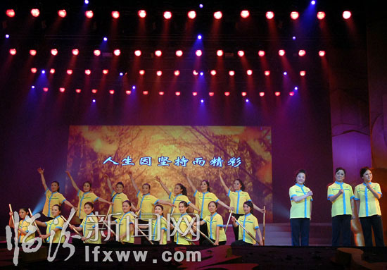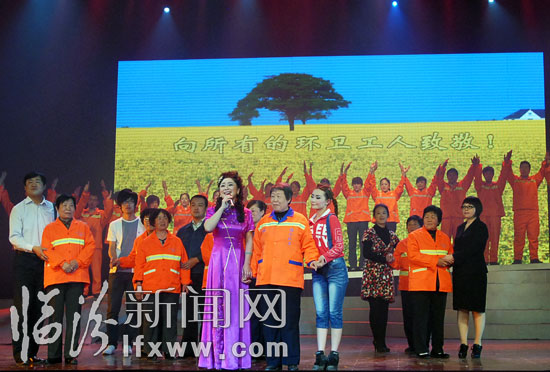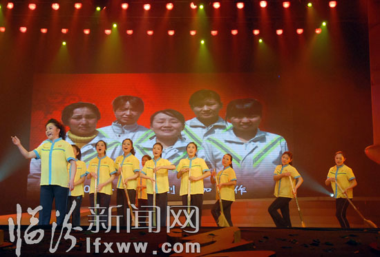临汾市环卫工人合唱团在歌唱环卫歌曲。