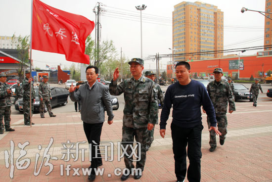 临汾军分区司令员赵世荣视察临汾开发区滨河办事处人武建设工作。