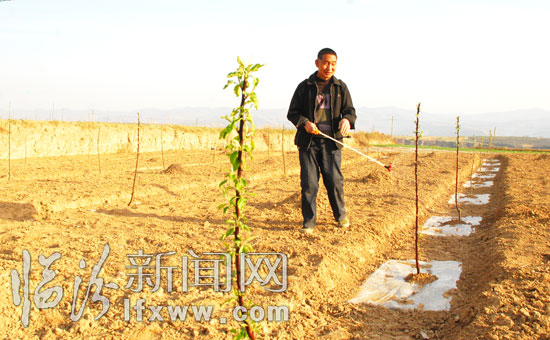 翼城县隆化镇牢寨村村民乔明俊正在给自家新栽植的苹果树打药。该村积极发展林果业,今年种植户新栽植了优质苹果1000亩。 本报记者 李自强 摄