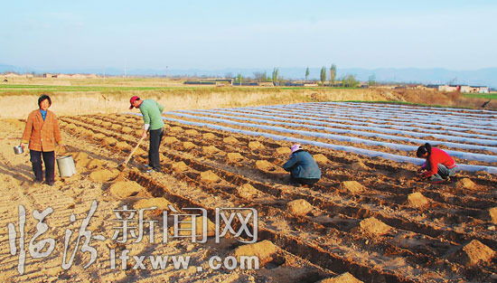 为全力做好抗旱保浇工作,连日来,我市各地积极引导农民及时调整种植结构,抓好农作物田间管理,确保农民增产增收。图为翼城县隆化镇隆化村村民正在种植西瓜。 本报记者 李自强 摄