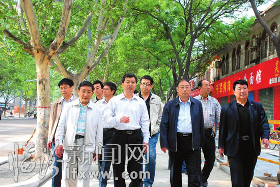 5月12日上午,市委副书记、市长罗清宇就新高中、新医院工程和城市道路建设工程进行调研,了解工程的进展情况。市委常委、副市长赵建民,市建设局负责人一同调研。图为罗清宇在迎春北街视察城市道路建设情况。本报记者 李自强 摄