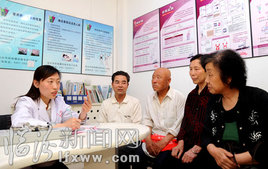 临汾新闻网讯 5月22日,临汾莉轶糖尿病门诊部举办了一场别开生面的糖尿病知识讲座,患者和专家面对面,讲解、提问、探讨等多种形式为一体,使广大患者对如何科学预防和治疗糖尿病有了全面的认识和理解。据了解,该门诊部每月一日都会举行糖尿病方面的知识讲座,并免费为患者测血糖和接受咨询,为大家发放糖尿病防治类书籍。图为当日,临汾莉轶糖尿病门诊部的专家在为患者做测血压、测血糖等检查。 (记者 闫锐鹏 摄影报道)