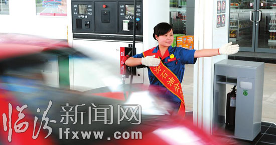 6月1日,路东加油站工作人员在进行车辆引导。我市开展“爱、树、建”活动以来,中石化临汾分公司强化管理、优化服务、提升形象,让加油站成为展示临汾形象的窗口。 记者 李虎威 摄
