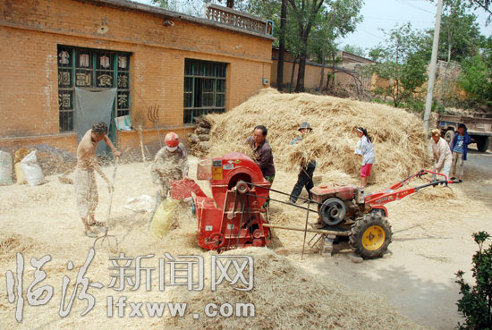 6月16日,在洪洞县曲亭镇古罗村,村民正在使用小麦脱粒机脱麦。受场地限制,许多村民购买的小型脱粒机配上小型电机或小马力柴油机,在自家院里脱麦,非常方便。(记者 李自强 摄)