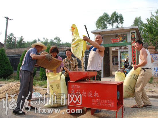 6月16日,在古县石壁乡贾村,村民王荣凯一家正在自家门口使用扬粮机扬小麦,确保小麦颗粒归藏。王荣凯高兴的告诉记者:“扬粮机便宜,操作简单,轻便好使,干活也省劲了,还提高夏收工作效率,很好”。(记者 李自强 摄)