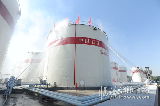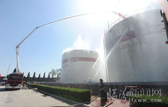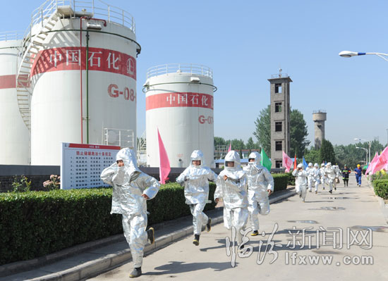 临汾新闻网讯 6月18日,我市举行危险化学品事故应急救援演练。本次演练模拟“中石化山西临汾石油分公司东芦油库一储油罐爆炸起火”这一突发事件,启动应急救援方案。消防、安监、石油、卫生、环保等专业应急救援队伍参加演练。各县市区安监部门和重点企业440余人观看了演练,本次演练旨在提高指挥协调能力、现场救援抢险能力、应急保障能力和处置突发事故能力,最大限度地降低和控制事故造成的损失。(记者 李虎威 摄)