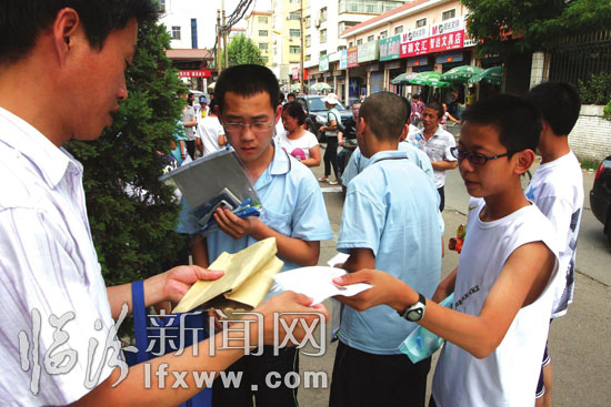 6月20日,酷热当头,2010中考开考。据了解,全市共有61200人报名参加考试,共设17个考区、72个考点、2049个考场。图为临汾一中考点外,精华中学的老师为防止考生考前忘拿准考证,采用准考证集中管理方式,帮助考生安心考试。记者 苏亚兵 摄