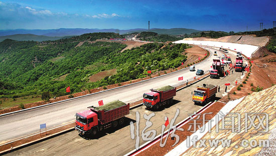 省道临午公路莽王路面铺筑现场,施工车辆正在紧张施工。临午公路改建工程开工以来,13个项目分部的数千筑路大军艰苦奋战、通力合作,工程顺利进展,目前,路基工程已全面完工,路面工程建设已全线铺开。 本报记者 闫锐鹏 摄