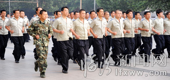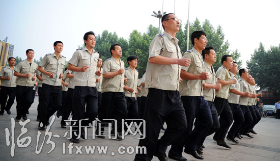 临汾新闻网讯 6月27日,市容监察支队的队员在参加军训。为进一步加强市容管理队伍纪律作风建设,该支队开展了为期20天的法律法规、文明管理、精神风貌为主要内容的学习教育和军事培训活动,旨在以严明的纪律,过硬的作风更好的服务于城市管理。(本网记者 闫锐鹏 摄影报道)