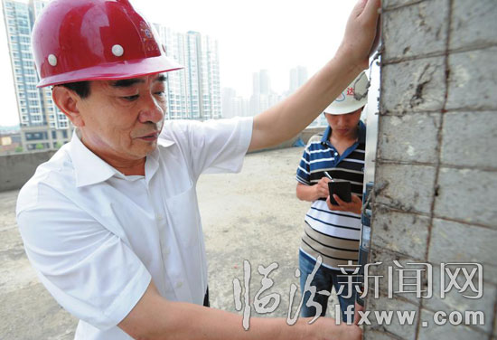 图为李云胜正在对施工中的大楼进行质量检测。 记者 李虎威 摄