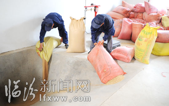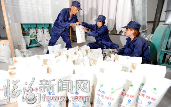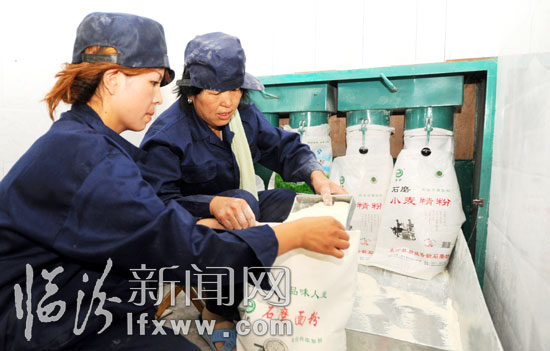 临汾新闻网讯 6月30日,襄汾县晋新石磨面粉厂的工人在包装刚磨出的面粉。该厂在传承传统加工工艺的基础上,采用石磨新工艺,通过低温冷磨的加工技术,不添加任何食品添加剂,保持了粮食的原汁原味,面粉进入市场以来走俏人们的餐桌。 (本网记者 闫锐鹏 摄)