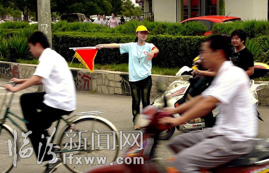 在临汾市鼓楼南红楼大十字路口上岗执勤的大三女大学生武苗璊告诉记者说,暑假期间自愿参与这次活动的大约有110名学生,他们多是大三大四学生,学生们自愿走上街头用实际行动体验和维护社会公共安全环境,这让他们感到非常快乐和光荣。(李典平 摄影报道)