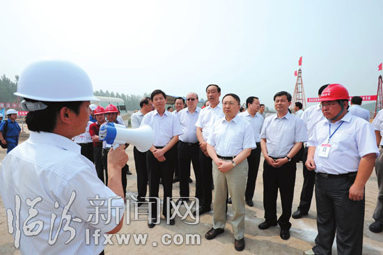 薛延忠一行冒着高温酷暑,深入中南部铁路通道汾河特大桥工程、4号搅拌站、南吕梁山隧道5号斜井建设工地,详细了解工程建设情况,看望慰问一线建设人员。当天下午,薛延忠在洪洞县主持召开座谈会,听取中南部铁路通道公司(筹建组)的工作汇报,并就工程建设中的有关问题同省直有关部门和临汾市进行了研究协调。会上,市委常委、常务副市长徐树荣代表我市就中南部铁路通道建设进展情况进行了汇报。