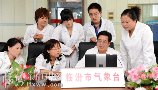 8月11日,临汾市气象台的工作人员在会商天气情况。