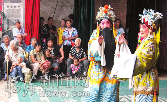 8月20日,襄汾县蒲剧团的演职人员在为村民演出。襄汾县襄陵镇黄崖村把丰富农村文化生活作为今年的工作重点,定期邀请剧团为村民演出,以村民喜闻乐见的形式丰富村民的文化生活。 (记者 闫锐鹏 摄)
