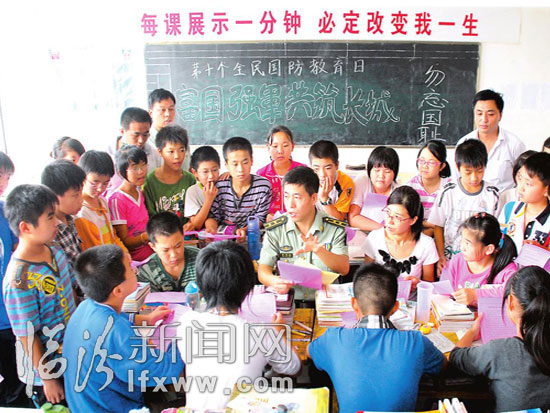 图为洪洞县人武部工作人员在睿博学校为学生讲解国防知识。 记者 李自强 摄