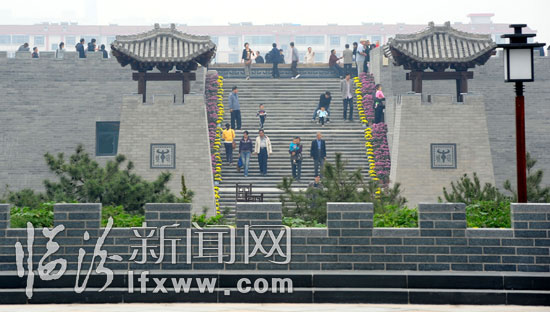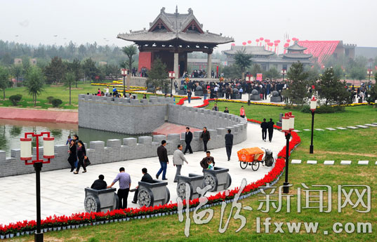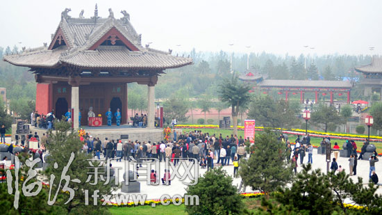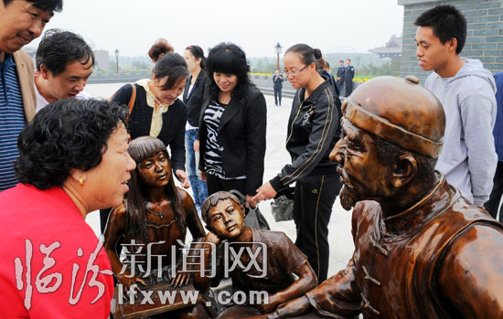 9月30日,在临汾古城公园,市民在园区观看文化雕塑。