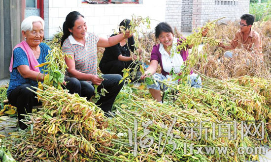 近日,尧都区土门镇李仵村的村民在分捡丰收的白豆。土门镇李仵村在大力发展葡萄种植的同时鼓励村民在田间套种秋粮,通过科学管理取得双丰收,为农民增收打下基础。