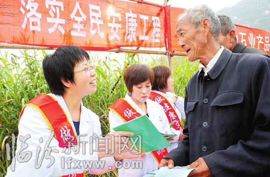 10月26日,大宁县疾控中心的工作人员在为村民讲解卫生知识。当日,大宁县疾控中心来到曲峨镇道教村开展了“我行动、我健康、我快乐”健康生活宣传活动,通过宣传板报、现场咨询的形式,指导村民健康生活。(记者 闫锐鹏 摄)