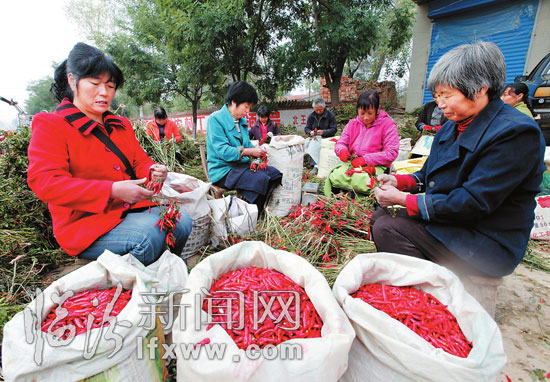 图为11月1日,该县北王乡椒农在采摘三樱椒。