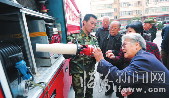 11月5日,临汾市消防支队官兵在军分区干休所向居民展示消防器材装备。随着“119消防宣传日”的到来,该支队官兵携带消防器材深入社区,为群众详细讲解火灾初期扑救、逃生和预防等相关知识。 李虎威 赵开宏 摄