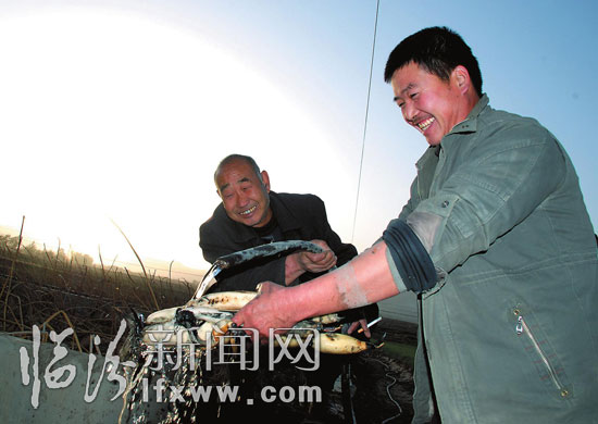 图为该村村民在用自来水冲洗刚采摘下的莲菜。刘利平 摄