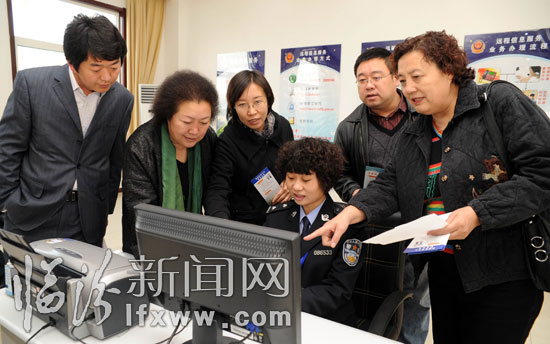 11月13日,在市公安局交警支队车管所,来自社会各界的政风行风监督员在了解车辆管理新业务。当日,市公安局召开2010年政风行风评议听证对话会。15名各界代表对市公安局今年以来在公安工作和近期老百姓关心的热点、难点问题提出了一些中肯的意见和建议。对于提出的问题,市公安局各各部门负责人本着认真、务实的态度,都做出了客观、负责的回答,确保政风行风建设真正取得实效、惠及群众。(记者 闫锐鹏 摄影报道)