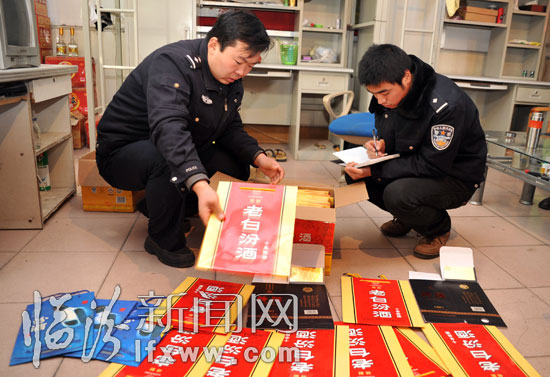 图为公安人员在清点登记假酒商标。