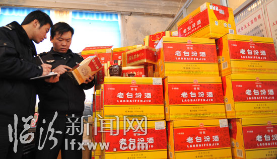 “两节”将至,烟酒制假贩假进入高发期。近日,蒲县公安局经济侦查大队根据群众举报,于11月26日晚抓获了在蒲县太林搬卸假烟假酒的方某某(男,42岁,安徽省蒙城县人)、穆某某(男,46岁,隰县人),当场查获假冒汾酒210件,另外还查获假“芙蓉王”烟40条,假“红河”烟20条,价值共计10万元。这是全省公安机关打击侵犯知识产权和制售伪劣商品犯罪“亮剑”专项行动开展以来,我市破获的最大一起制假售假案件。