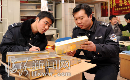 图为公安人员在清点查获的假烟。