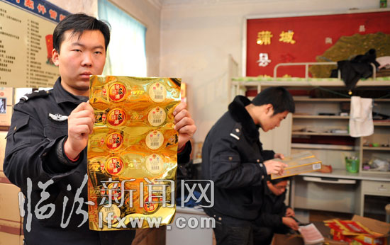 图为公安人员在清点查获的假酒包装。
