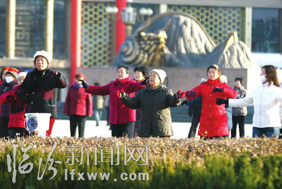 “我们跳的是广场舞,都是跟网上的教学视频学的。既能跳舞,又能锻炼身体,一举两得。”1月11日9时,记者在鼓楼广场看到,排列整齐的队伍正有节奏地跳着健身操。 一名退休干部说:“早晨太冷,空气污染较大,我们都是等太阳出来后再锻炼,希望广大中老年人冬季晨练不要出来太早,这样不利于身体健康。”(记者 苏亚兵 摄)