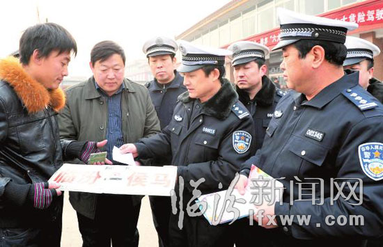 1月18日,市公安局交警支队的工作人员在为公路营运人员发放春运运营证书。当日,全市2011年春运道路交通安全工作启动,交警部门工作人员设立宣传点、发放手册,全力保障春运工作顺利开展。 记者 闫锐鹏 摄