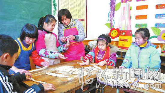 1月30日是农历腊月廿七,侯马市子益直映学校小学生在老师指导下兴致勃勃地搓麻花。连日来,老师和孩子们一起蒸花馍、做绣球、剪窗花、包饺子,体验民俗,迎接兔年。冯文芳 摄