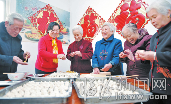 2月1日,在尧都区中心敬老院,老人们在包饺子。当日,尧都区中心敬老院的80余位老人与职工欢聚一堂,一起包饺子、贴“福”字,迎新春、过大年。 记者 闫锐鹏 摄