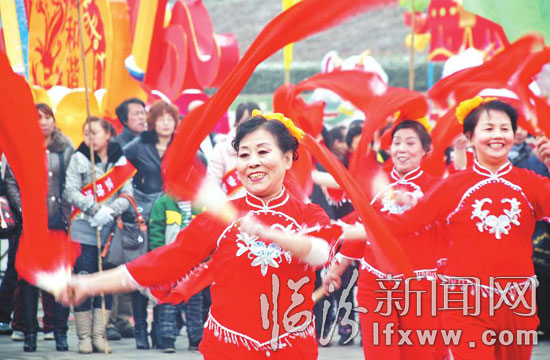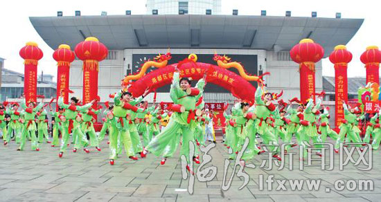 2月10日,尧都区鼓楼西街办事处在平阳广场举办春节文化活动展演,社区居民们以传统的社火形式,载歌载舞欢庆春节。 记者 李自强 摄