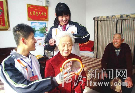 “阳光雨露”青年志愿者为87岁的李俊英老人梳头发