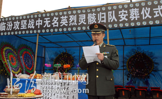 图为临汾攻坚战中牺牲的无名英烈灵骸归队安葬仪式现场。