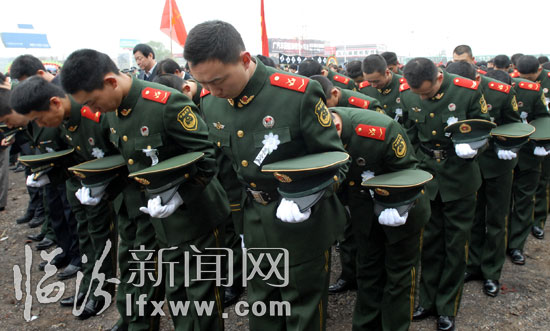 图为武警官兵在为临汾攻坚战中牺牲的无名英烈默哀。