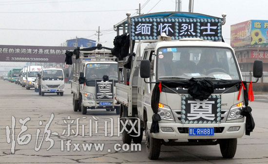 图为运送英烈灵骸的灵车在开往临汾烈士陵园。